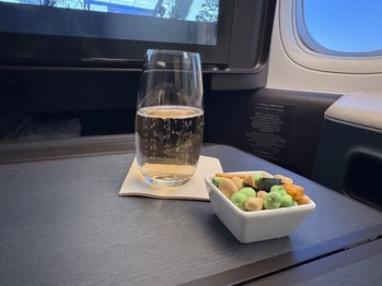 初のアリアスイートはプライベート感もあり快適です➡️詳細さて問題の機内食の時間です?シャンパン?とおつまみパサパサのサラダ?に、カチカチの蕎麦お···